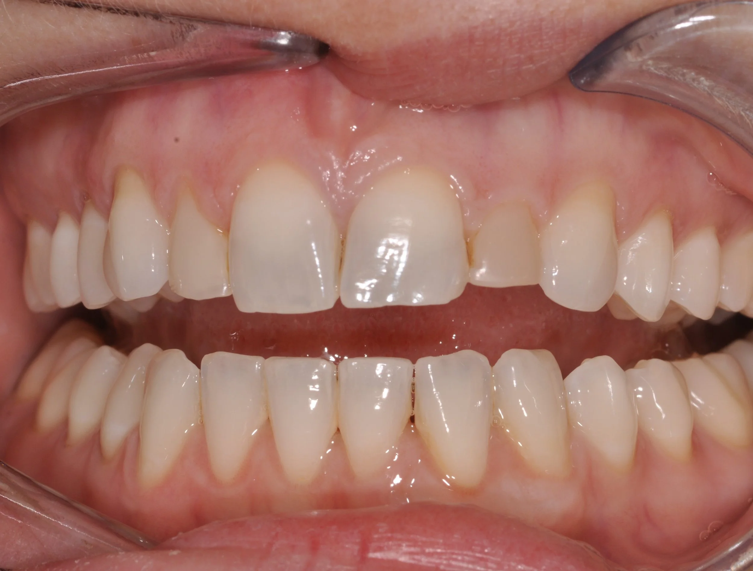 This client was unhappy with her smile, veneers were placed on the lateral ( side incisors) to give the patient a more even smile.